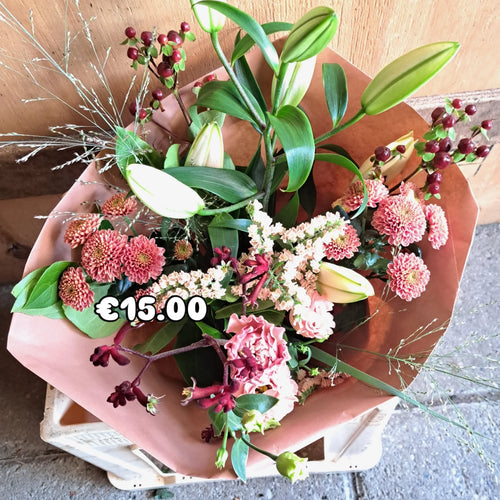 Het afgebeelde boeket is een middelgroot boeket van €15,00.